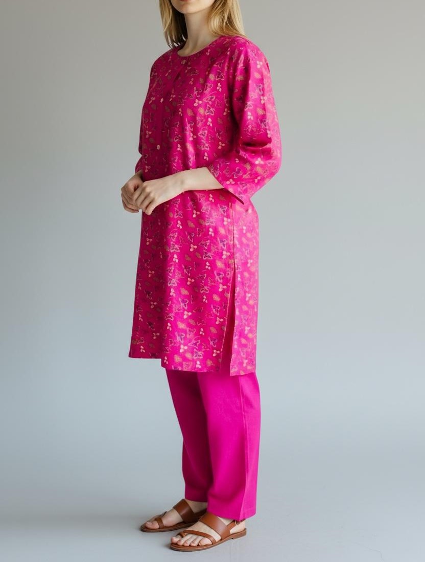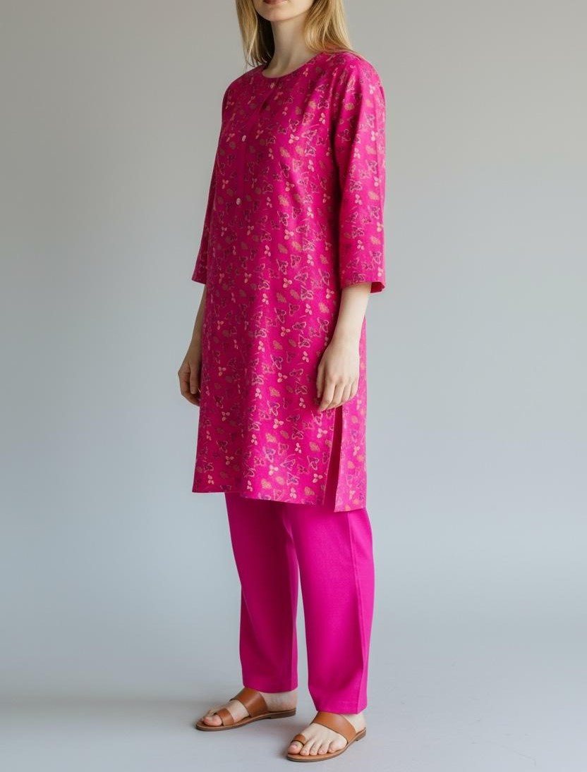 Description: Winter dhanak straight printed kurta, featuring full sleeves and round neckline