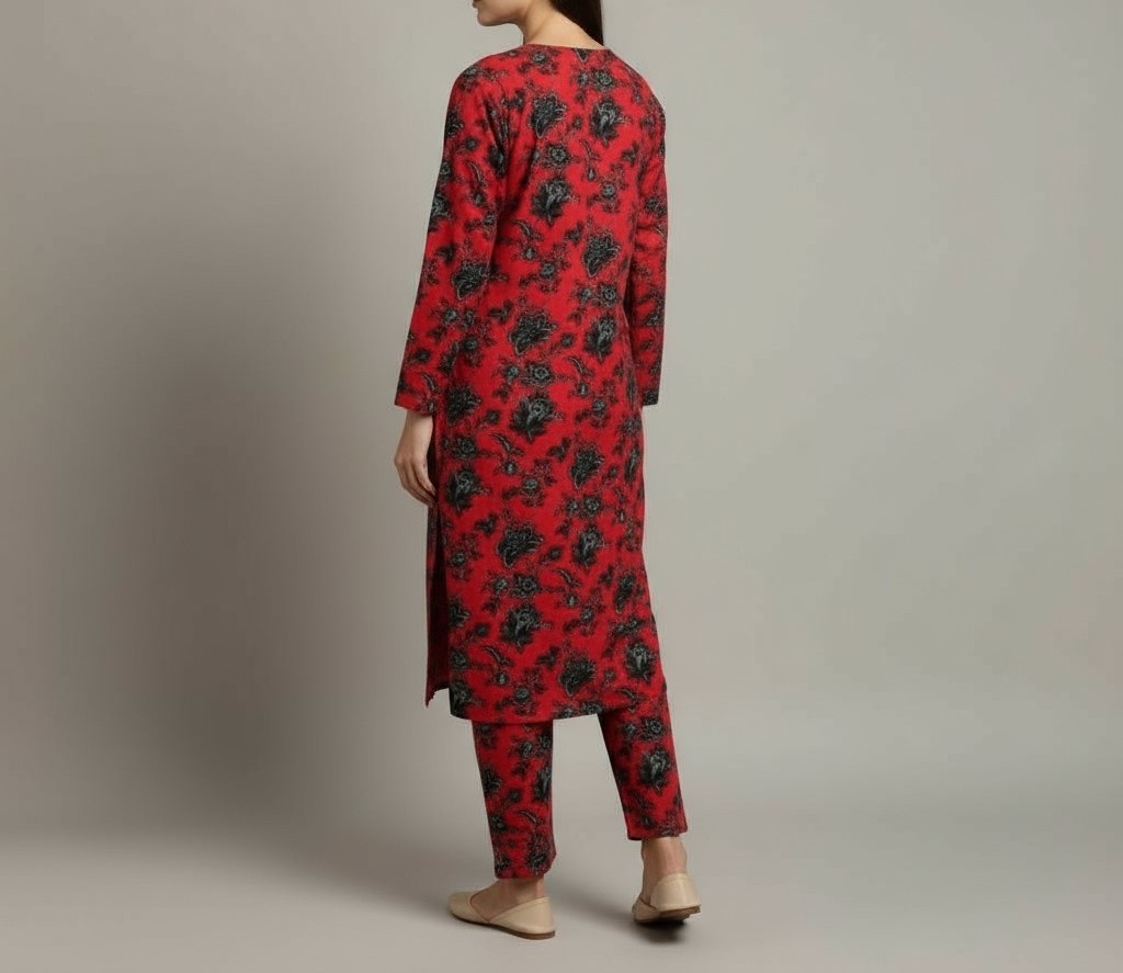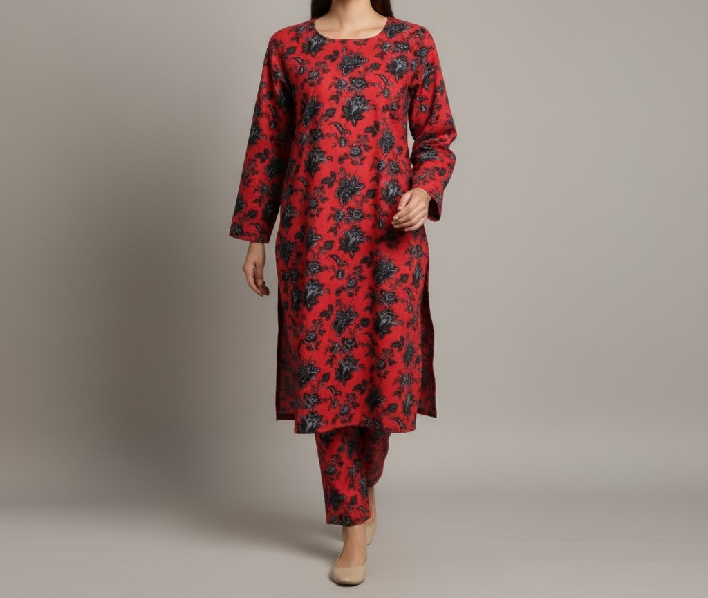 Description: Khaddar straight printed kurta, featuring full sleeves and round neckline