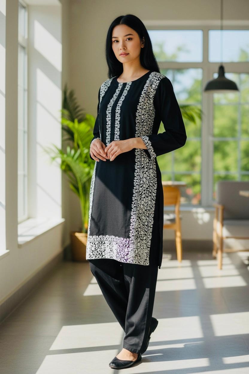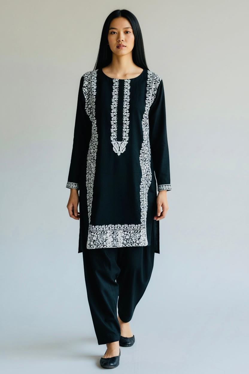Description: Khaddar straight embroidered kurta, featuring full sleeves and round neckline
